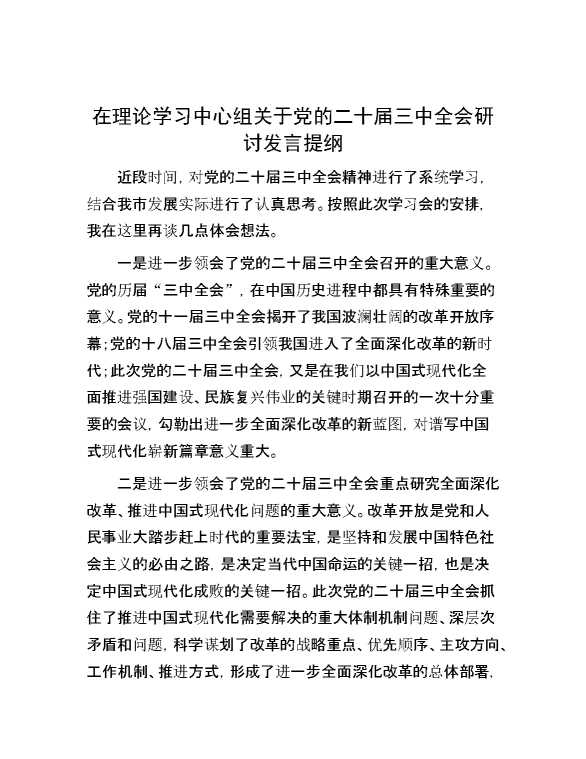 在理论学习中心组关于党的二十届三中全会研讨发言提纲 2024-10-23 Word模板 59 购买前,请一定要先点击这里看看,欢迎持续关注,精彩模板每天推送 预览结束,本文件为word文档,一共4页,共1583字,请购买后,下载后查看 购买前,请一定要先点击这里看看,欢迎持续关注,精彩模板每天推送 资源下载下载价格29 RMBVIP免费升级VIP点击检测网盘有效后购买有任何充值和下载问题请加微信:xuexixuexi66 0 演讲发言