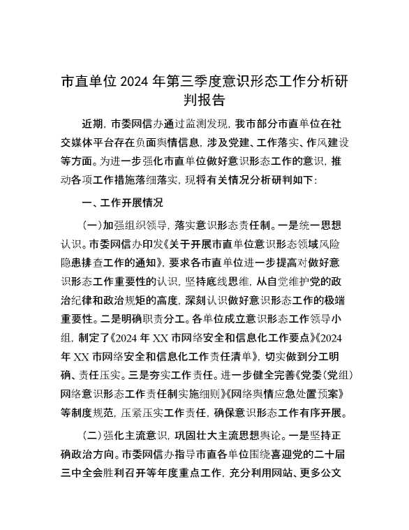 市直单位2024年第三季度意识形态工作分析研判报告 2024-10-23 Word模板 67 购买前,请一定要先点击这里看看,欢迎持续关注,精彩模板每天推送 预览结束,本文件为word文档,一共5页,共2430字,请购买后,下载后查看 购买前,请一定要先点击这里看看,欢迎持续关注,精彩模板每天推送 资源下载下载价格29 RMBVIP免费升级VIP点击检测网盘有效后购买有任何充值和下载问题请加微信:xuexixuexi66 0 总结汇报