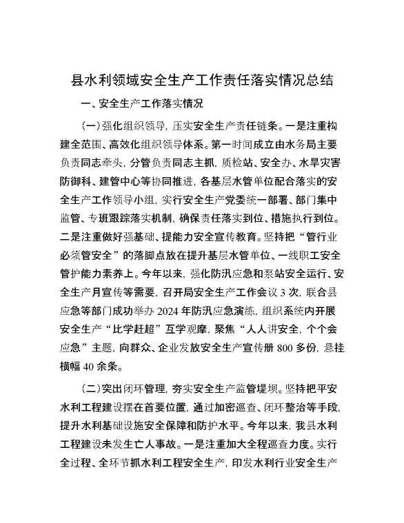 县水利领域安全生产工作责任落实情况总结 2024-10-23 Word模板 62 购买前,请一定要先点击这里看看,欢迎持续关注,精彩模板每天推送 预览结束,本文件为word文档,一共4页,共1595字,请购买后,下载后查看 购买前,请一定要先点击这里看看,欢迎持续关注,精彩模板每天推送 资源下载下载价格29 RMBVIP免费升级VIP点击检测网盘有效后购买有任何充值和下载问题请加微信:xuexixuexi66 0 总结汇报
