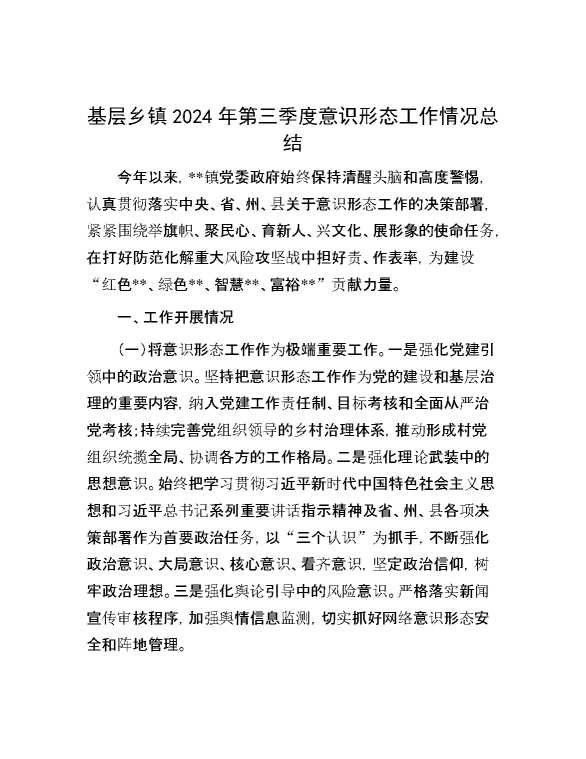 基层乡镇2024年第三季度意识形态工作情况总结 2024-10-23 Word模板 65 购买前,请一定要先点击这里看看,欢迎持续关注,精彩模板每天推送 预览结束,本文件为word文档,一共6页,共2622字,请购买后,下载后查看 购买前,请一定要先点击这里看看,欢迎持续关注,精彩模板每天推送 资源下载下载价格29 RMBVIP免费升级VIP立即购买有任何充值和下载问题请加微信:xuexixuexi66 0 总结汇报