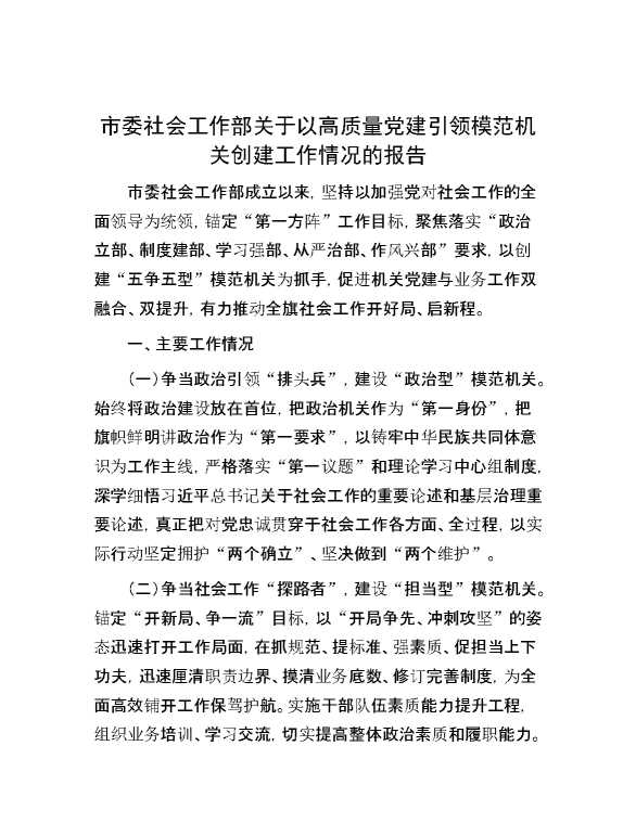 市委社会工作部关于以高质量党建引领模范机关创建工作情况的报告 2024-10-23 Word模板 61 购买前,请一定要先点击这里看看,欢迎持续关注,精彩模板每天推送 预览结束,本文件为word文档,一共4页,共1658字,请购买后,下载后查看 购买前,请一定要先点击这里看看,欢迎持续关注,精彩模板每天推送 资源下载下载价格29 RMBVIP免费升级VIP点击检测网盘有效后购买有任何充值和下载问题请加微信:xuexixuexi66 0 总结汇报