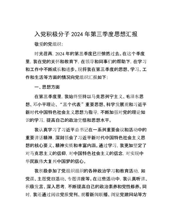 入党积极分子 2024 年第三季度思想汇报 2024-10-23 Word模板 94 购买前,请一定要先点击这里看看,欢迎持续关注,精彩模板每天推送 预览结束,本文件为word文档,一共7页,共3001字,请购买后,下载后查看 购买前,请一定要先点击这里看看,欢迎持续关注,精彩模板每天推送 资源下载下载价格29 RMBVIP免费升级VIP点击检测网盘有效后购买有任何充值和下载问题请加微信:xuexixuexi66 0 总结汇报