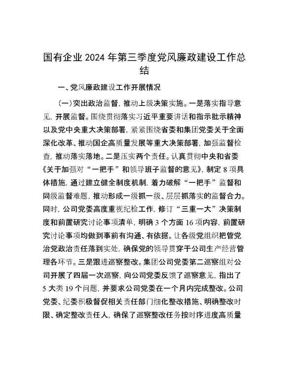 国有企业2024年第三季度党风廉政建设工作总结 2024-10-23 Word模板 64 购买前,请一定要先点击这里看看,欢迎持续关注,精彩模板每天推送 预览结束,本文件为word文档,一共7页,共3116字,请购买后,下载后查看 购买前,请一定要先点击这里看看,欢迎持续关注,精彩模板每天推送 资源下载下载价格29 RMBVIP免费升级VIP点击检测网盘有效后购买有任何充值和下载问题请加微信:xuexixuexi66 0 总结汇报