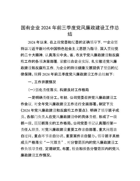 国有企业 2024 年前三季度党风廉政建设工作总结 2024-10-23 Word模板 71 购买前,请一定要先点击这里看看,欢迎持续关注,精彩模板每天推送 预览结束,本文件为word文档,一共7页,共3032字,请购买后,下载后查看 购买前,请一定要先点击这里看看,欢迎持续关注,精彩模板每天推送 资源下载下载价格29 RMBVIP免费升级VIP点击检测网盘有效后购买有任何充值和下载问题请加微信:xuexixuexi66 0 总结汇报