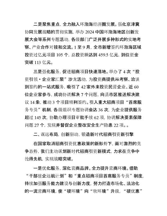 某市招商引资工作情况汇报 2024-10-23 Word模板 61 购买前,请一定要先点击这里看看,欢迎持续关注,精彩模板每天推送 预览结束,本文件为word文档,一共4页,共1848字,请购买后,下载后查看 购买前,请一定要先点击这里看看,欢迎持续关注,精彩模板每天推送 资源下载下载价格29 RMBVIP免费升级VIP点击检测网盘有效后购买有任何充值和下载问题请加微信:xuexixuexi66 0 总结汇报