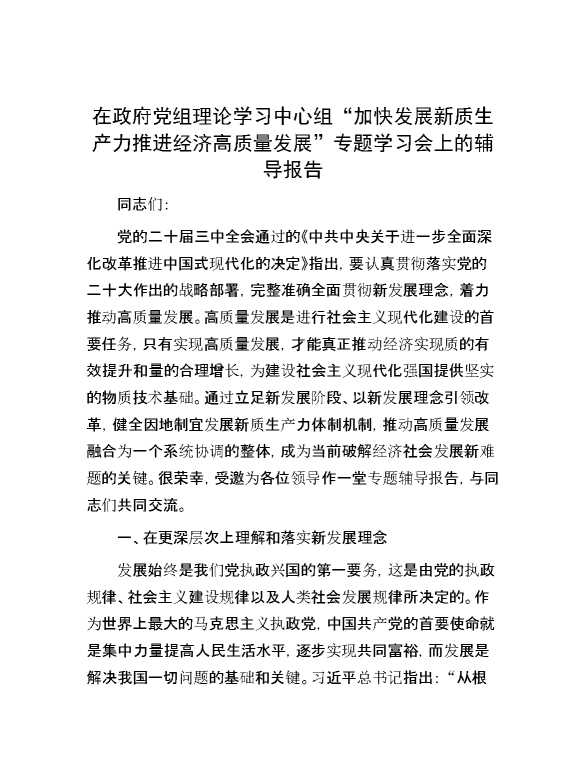 在政府党组理论学习中心组“加快发展新质生产力 推进经济高质量发展”专题学习会上的辅导报告 2024-10-23 Word模板 59 购买前,请一定要先点击这里看看,欢迎持续关注,精彩模板每天推送 预览结束,本文件为word文档,一共16页,共8270字,请购买后,下载后查看 购买前,请一定要先点击这里看看,欢迎持续关注,精彩模板每天推送 资源下载下载价格29 RMBVIP免费升级VIP点击检测网盘有效后购买有任何充值和下载问题请加微信:xuexixuexi66 0 总结汇报
