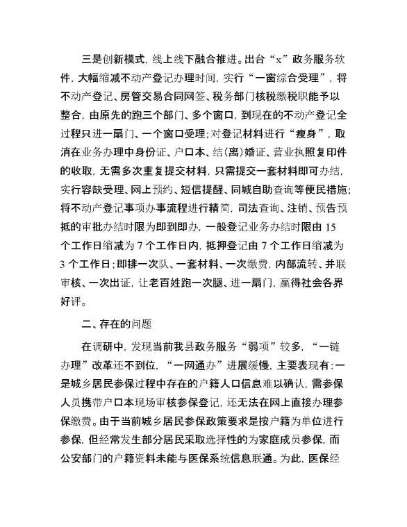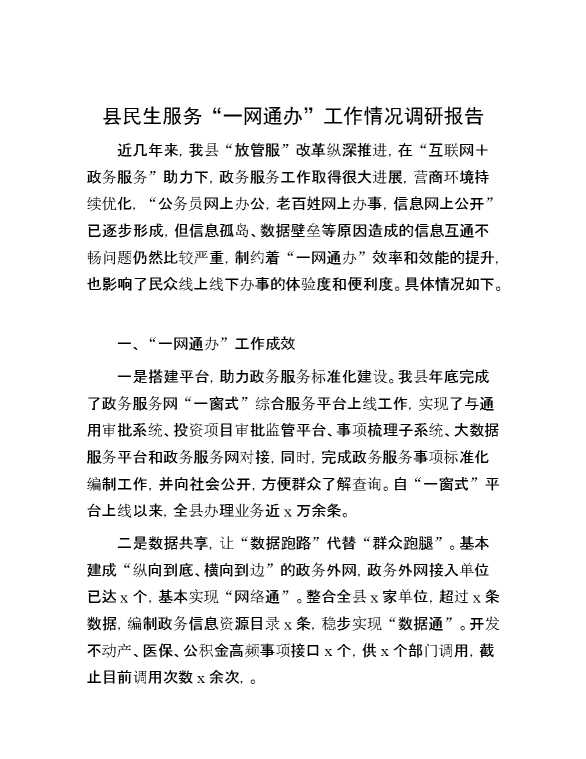 县民生服务“一网通办”工作情况调研报告 2024-10-23 Word模板 59 购买前,请一定要先点击这里看看,欢迎持续关注,精彩模板每天推送 预览结束,本文件为word文档,一共5页,共2004字,请购买后,下载后查看 购买前,请一定要先点击这里看看,欢迎持续关注,精彩模板每天推送 资源下载下载价格29 RMBVIP免费升级VIP点击检测网盘有效后购买有任何充值和下载问题请加微信:xuexixuexi66 0 总结汇报