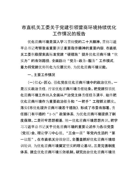 市直机关工委关于党建引领营商环境持续优化工作情况的报告 2024-10-23 Word模板 62 购买前,请一定要先点击这里看看,欢迎持续关注,精彩模板每天推送 预览结束,本文件为word文档,一共4页,共1505字,请购买后,下载后查看 购买前,请一定要先点击这里看看,欢迎持续关注,精彩模板每天推送 资源下载下载价格29 RMBVIP免费升级VIP立即购买有任何充值和下载问题请加微信:xuexixuexi66 0 总结汇报