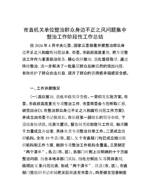 市直机关单位整治群众身边不正之风问题集中整治工作阶段性工作总结 2024-10-23 Word模板 59 购买前,请一定要先点击这里看看,欢迎持续关注,精彩模板每天推送 预览结束,本文件为word文档,一共6页,共2677字,请购买后,下载后查看 购买前,请一定要先点击这里看看,欢迎持续关注,精彩模板每天推送 资源下载下载价格29 RMBVIP免费升级VIP点击检测网盘有效后购买有任何充值和下载问题请加微信:xuexixuexi66 0 总结汇报
