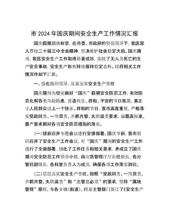 市2024年国庆期间安全生产工作情况汇报 2024-10-23 Word模板 69 购买前,请一定要先点击这里看看,欢迎持续关注,精彩模板每天推送 预览结束,本文件为word文档,一共6页,共2562字,请购买后,下载后查看 购买前,请一定要先点击这里看看,欢迎持续关注,精彩模板每天推送 资源下载下载价格29 RMBVIP免费升级VIP点击检测网盘有效后购买有任何充值和下载问题请加微信:xuexixuexi66 0 总结汇报