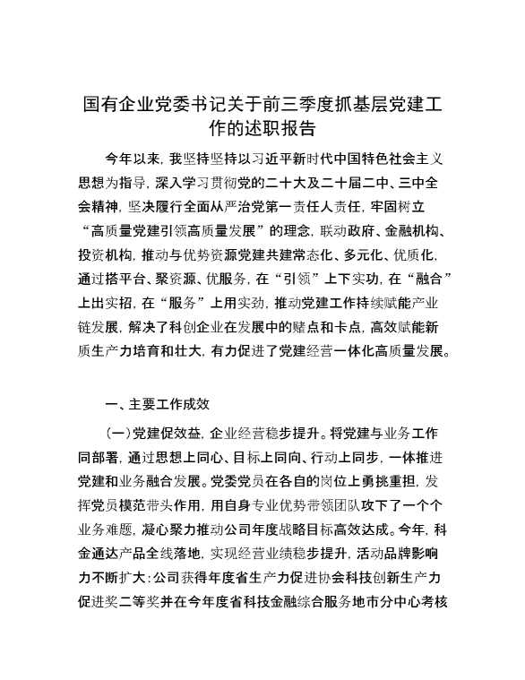国有企业党委书记关于前三季度抓基层党建工作的述职报告 2024-10-23 Word模板 73 购买前,请一定要先点击这里看看,欢迎持续关注,精彩模板每天推送 预览结束,本文件为word文档,一共7页,共3202字,请购买后,下载后查看 购买前,请一定要先点击这里看看,欢迎持续关注,精彩模板每天推送 资源下载下载价格29 RMBVIP免费升级VIP点击检测网盘有效后购买有任何充值和下载问题请加微信:xuexixuexi66 0 总结汇报
