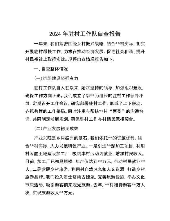 2024年驻村工作队自查报告 2024-10-23 Word模板 73 购买前,请一定要先点击这里看看,欢迎持续关注,精彩模板每天推送 预览结束,本文件为word文档,一共7页,共2530字,请购买后,下载后查看 购买前,请一定要先点击这里看看,欢迎持续关注,精彩模板每天推送 资源下载下载价格29 RMBVIP免费升级VIP点击检测网盘有效后购买有任何充值和下载问题请加微信:xuexixuexi66 0 总结汇报
