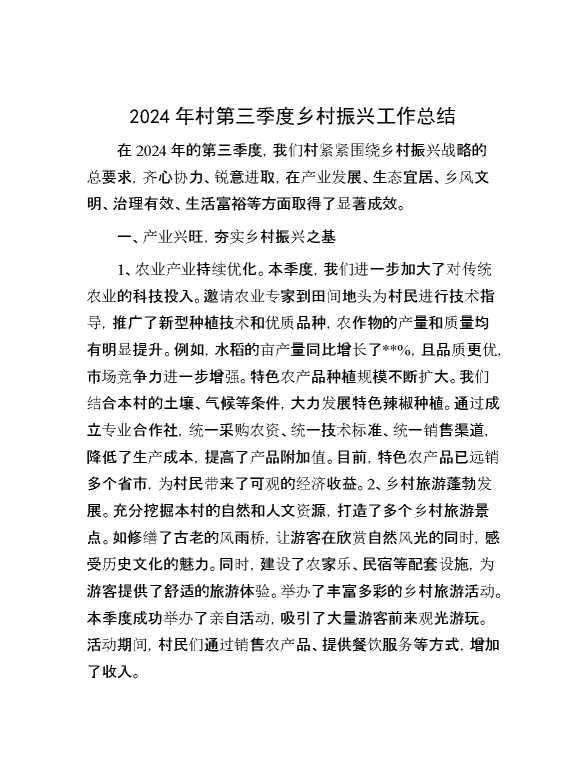 2024年村第三季度乡村振兴工作总结 2024-10-23 Word模板 67 购买前,请一定要先点击这里看看,欢迎持续关注,精彩模板每天推送 预览结束,本文件为word文档,一共4页,共1783字,请购买后,下载后查看 购买前,请一定要先点击这里看看,欢迎持续关注,精彩模板每天推送 资源下载下载价格29 RMBVIP免费升级VIP点击检测网盘有效后购买有任何充值和下载问题请加微信:xuexixuexi66 0 总结汇报