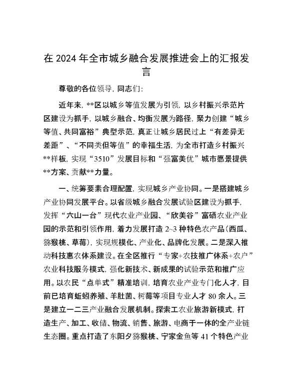 在2024年全市城乡融合发展推进会上的汇报发言 2024-10-25 Word模板 67 购买前,请一定要先点击这里看看,欢迎持续关注,精彩模板每天推送 预览结束,本文件为word文档,一共4页,共1892字,请购买后,下载后查看 购买前,请一定要先点击这里看看,欢迎持续关注,精彩模板每天推送 资源下载下载价格29 RMBVIP免费升级VIP点击检测网盘有效后购买有任何充值和下载问题请加微信:xuexixuexi66 0 演讲发言