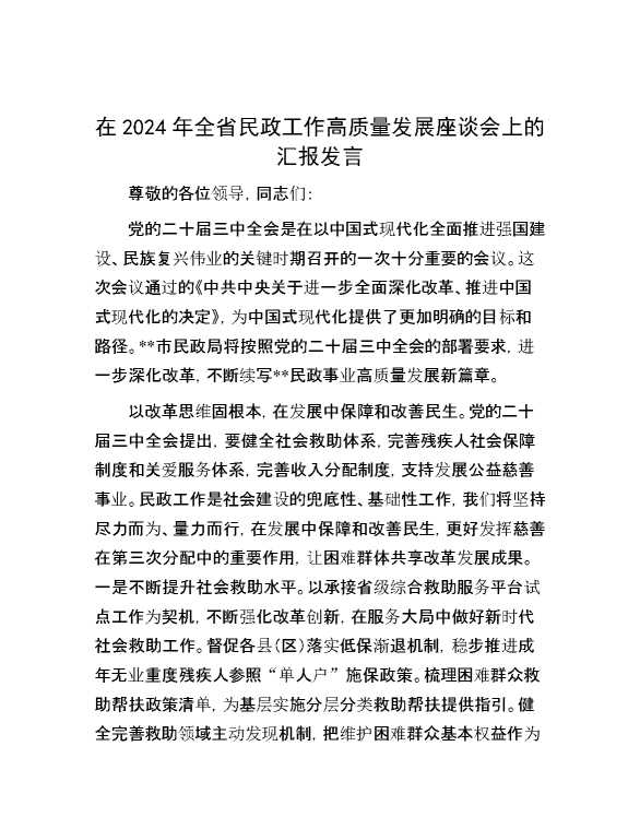 在2024年全省民政工作高质量发展座谈会上的汇报发言 2024-10-25 Word模板 65 购买前,请一定要先点击这里看看,欢迎持续关注,精彩模板每天推送 预览结束,本文件为word文档,一共5页,共2414字,请购买后,下载后查看 购买前,请一定要先点击这里看看,欢迎持续关注,精彩模板每天推送 资源下载下载价格29 RMBVIP免费升级VIP点击检测网盘有效后购买有任何充值和下载问题请加微信:xuexixuexi66 0 演讲发言