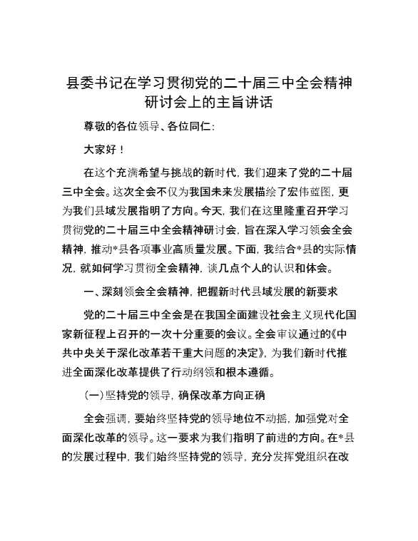县委书记在学习贯彻党的二十届三中全会精神研讨会上的主旨讲话 2024-10-25 Word模板 62 购买前,请一定要先点击这里看看,欢迎持续关注,精彩模板每天推送 预览结束,本文件为word文档,一共5页,共2224字,请购买后,下载后查看 购买前,请一定要先点击这里看看,欢迎持续关注,精彩模板每天推送 资源下载下载价格29 RMBVIP免费升级VIP点击检测网盘有效后购买有任何充值和下载问题请加微信:xuexixuexi66 0 演讲发言