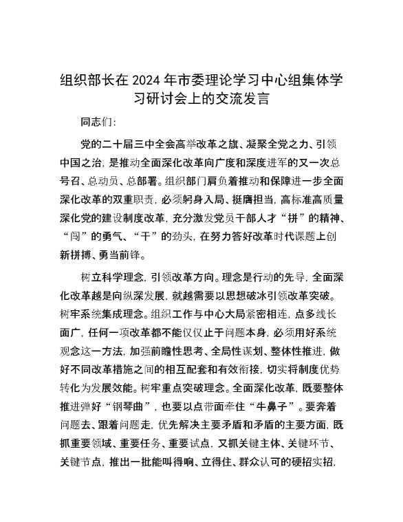 组织部长在2024年市委理论学习中心组集体学习研讨会上的交流发言 2024-10-25 Word模板 94 购买前,请一定要先点击这里看看,欢迎持续关注,精彩模板每天推送 预览结束,本文件为word文档,一共5页,共2290字,请购买后,下载后查看 购买前,请一定要先点击这里看看,欢迎持续关注,精彩模板每天推送 资源下载下载价格29 RMBVIP免费升级VIP点击检测网盘有效后购买有任何充值和下载问题请加微信:xuexixuexi66 0 演讲发言