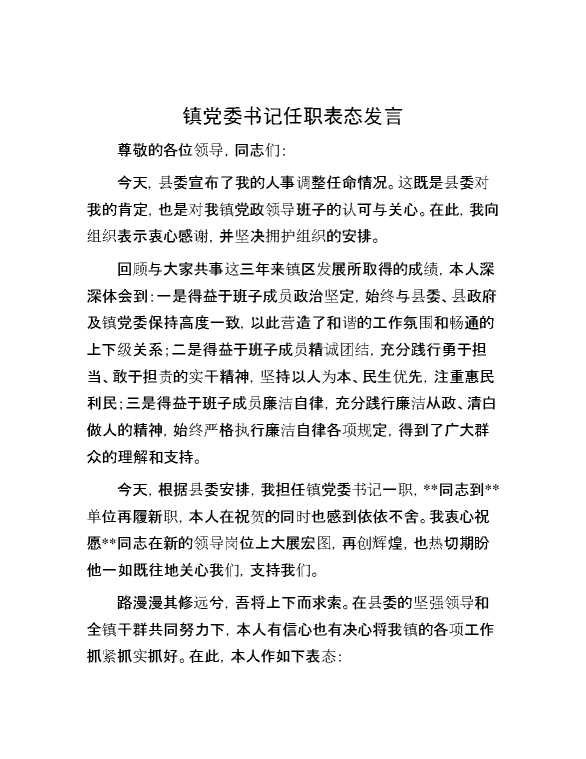 镇党委书记任职表态发言 2024-10-25 Word模板 91 购买前,请一定要先点击这里看看,欢迎持续关注,精彩模板每天推送 预览结束,本文件为word文档,一共2页,共860字,请购买后,下载后查看 购买前,请一定要先点击这里看看,欢迎持续关注,精彩模板每天推送 资源下载下载价格29 RMBVIP免费升级VIP点击检测网盘有效后购买有任何充值和下载问题请加微信:xuexixuexi66 0 演讲发言