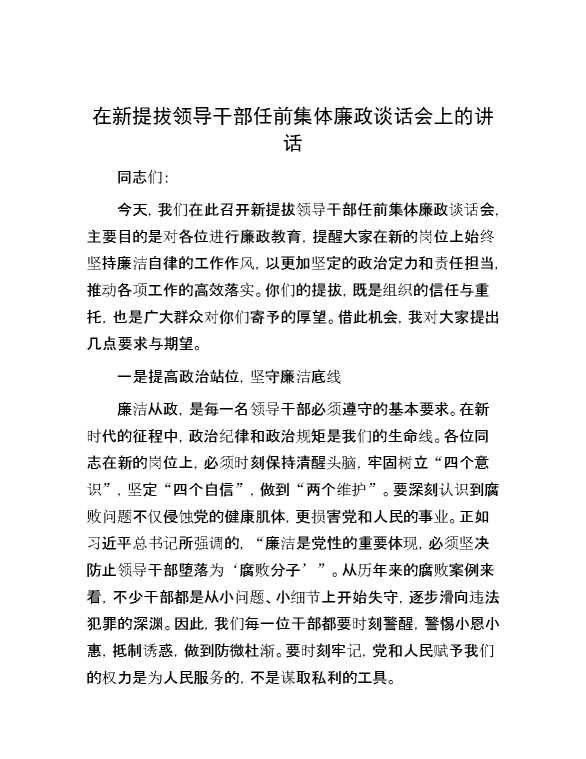 在新提拔领导干部任前集体廉政谈话会上的讲话 2024-10-25 Word模板 97 购买前,请一定要先点击这里看看,欢迎持续关注,精彩模板每天推送 预览结束,本文件为word文档,一共4页,共1790字,请购买后,下载后查看 购买前,请一定要先点击这里看看,欢迎持续关注,精彩模板每天推送 资源下载下载价格29 RMBVIP免费升级VIP点击检测网盘有效后购买有任何充值和下载问题请加微信:xuexixuexi66 0 演讲发言
