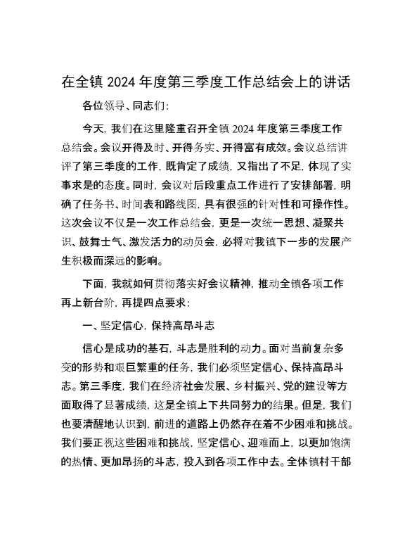 在全镇2024年度第三季度工作总结会上的讲话 2024-10-25 Word模板 91 购买前,请一定要先点击这里看看,欢迎持续关注,精彩模板每天推送 预览结束,本文件为word文档,一共4页,共1729字,请购买后,下载后查看 购买前,请一定要先点击这里看看,欢迎持续关注,精彩模板每天推送 资源下载下载价格29 RMBVIP免费升级VIP点击检测网盘有效后购买有任何充值和下载问题请加微信:xuexixuexi66 0 演讲发言