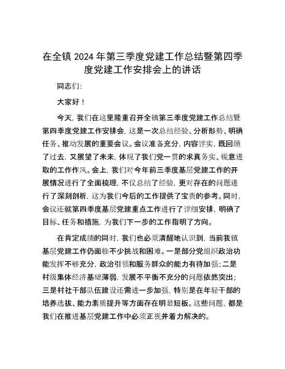 在全镇2024年第三季度党建工作总结暨第四季度党建工作安排会上的讲话 2024-10-25 Word模板 93 购买前,请一定要先点击这里看看,欢迎持续关注,精彩模板每天推送 预览结束,本文件为word文档,一共3页,共1409字,请购买后,下载后查看 购买前,请一定要先点击这里看看,欢迎持续关注,精彩模板每天推送 资源下载下载价格29 RMBVIP免费升级VIP点击检测网盘有效后购买有任何充值和下载问题请加微信:xuexixuexi66 0 演讲发言