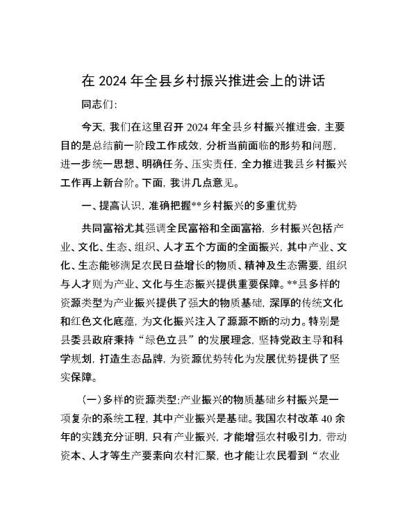 在2024年全县乡村振兴推进会上的讲话 2024-10-25 Word模板 107 购买前,请一定要先点击这里看看,欢迎持续关注,精彩模板每天推送 预览结束,本文件为word文档,一共22页,共10814字,请购买后,下载后查看 购买前,请一定要先点击这里看看,欢迎持续关注,精彩模板每天推送 资源下载下载价格29 RMBVIP免费升级VIP点击检测网盘有效后购买有任何充值和下载问题请加微信:xuexixuexi66 0 演讲发言