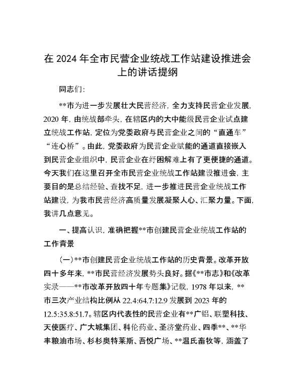 在2024年全市民营企业统战工作站建设推进会上的讲话提纲 2024-10-25 Word模板 109 购买前,请一定要先点击这里看看,欢迎持续关注,精彩模板每天推送 预览结束,本文件为word文档,一共10页,共4961字,请购买后,下载后查看 购买前,请一定要先点击这里看看,欢迎持续关注,精彩模板每天推送 资源下载下载价格29 RMBVIP免费升级VIP点击检测网盘有效后购买有任何充值和下载问题请加微信:xuexixuexi66 0 演讲发言