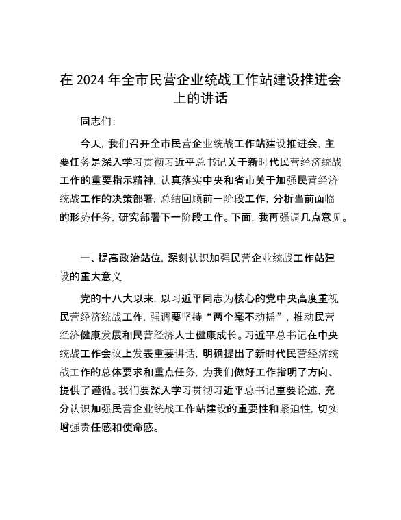 在2024年全市民营企业统战工作站建设推进会上的讲话 2024-10-25 Word模板 108 购买前,请一定要先点击这里看看,欢迎持续关注,精彩模板每天推送 预览结束,本文件为word文档,一共6页,共2390字,请购买后,下载后查看 购买前,请一定要先点击这里看看,欢迎持续关注,精彩模板每天推送 资源下载下载价格29 RMBVIP免费升级VIP点击检测网盘有效后购买有任何充值和下载问题请加微信:xuexixuexi66 0 演讲发言