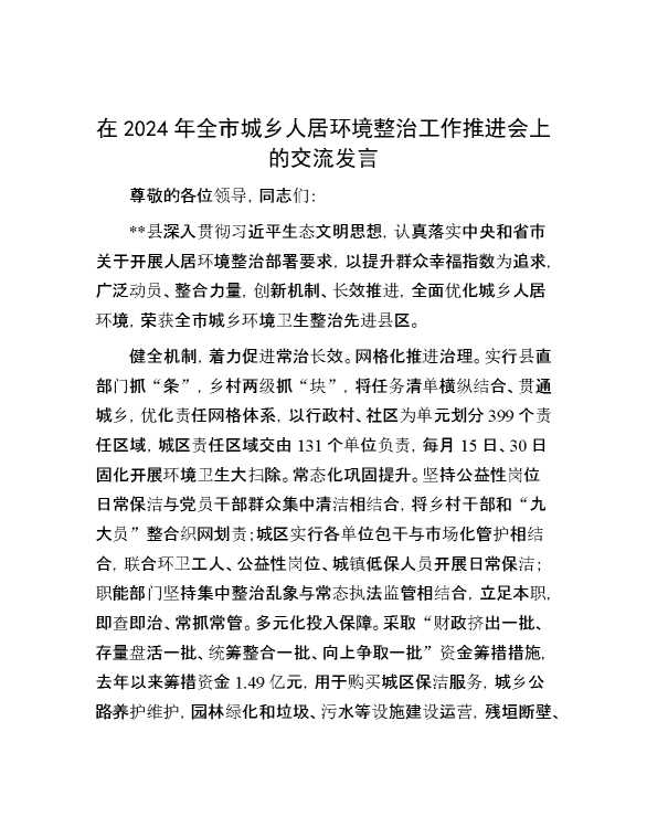 在2024年全市城乡人居环境整治工作推进会上的交流发言 2024-10-25 Word模板 101 购买前,请一定要先点击这里看看,欢迎持续关注,精彩模板每天推送 预览结束,本文件为word文档,一共3页,共1410字,请购买后,下载后查看 购买前,请一定要先点击这里看看,欢迎持续关注,精彩模板每天推送 资源下载下载价格29 RMBVIP免费升级VIP点击检测网盘有效后购买有任何充值和下载问题请加微信:xuexixuexi66 0 演讲发言