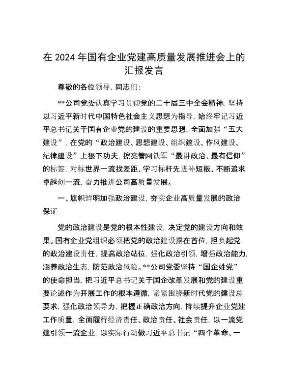 在2024年国有企业党建高质量发展推进会上的汇报发言 2024-10-25 Word模板 110 购买前,请一定要先点击这里看看,欢迎持续关注,精彩模板每天推送 预览结束,本文件为word文档,一共8页,共3572字,请购买后,下载后查看 购买前,请一定要先点击这里看看,欢迎持续关注,精彩模板每天推送 资源下载下载价格29 RMBVIP免费升级VIP点击检测网盘有效后购买有任何充值和下载问题请加微信:xuexixuexi66 0 演讲发言
