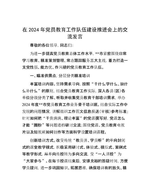 在2024年党员教育工作队伍建设推进会上的交流发言 2024-10-25 Word模板 113 购买前,请一定要先点击这里看看,欢迎持续关注,精彩模板每天推送 预览结束,本文件为word文档,一共5页,共1939字,请购买后,下载后查看 购买前,请一定要先点击这里看看,欢迎持续关注,精彩模板每天推送 资源下载下载价格29 RMBVIP免费升级VIP点击检测网盘有效后购买有任何充值和下载问题请加微信:xuexixuexi66 0 演讲发言