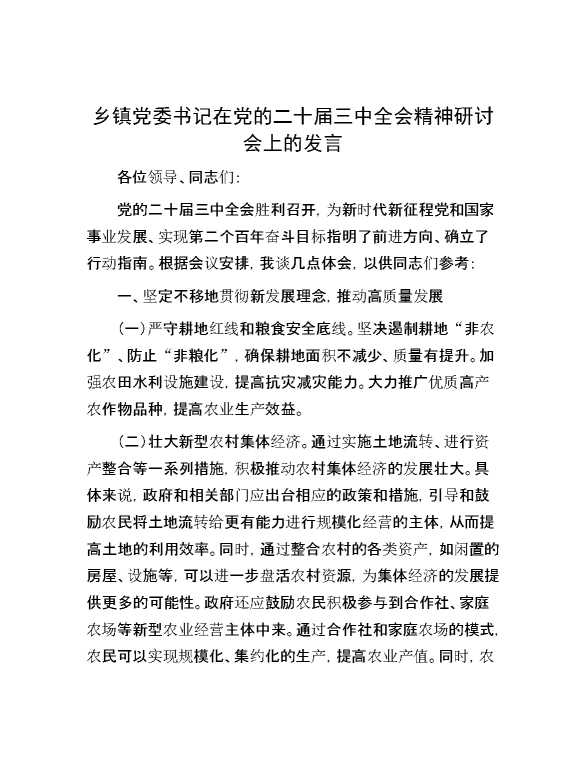 乡镇党委书记在党的二十届三中全会精神研讨会上的发言【45304】 2024-10-25 Word模板 146 购买前,请一定要先点击这里看看,欢迎持续关注,精彩模板每天推送 预览结束,本文件为word文档,一共6页,共2767字,请购买后,下载后查看 购买前,请一定要先点击这里看看,欢迎持续关注,精彩模板每天推送 资源下载下载价格29 RMBVIP免费升级VIP点击检测网盘有效后购买有任何充值和下载问题请加微信:xuexixuexi66 0 演讲发言
