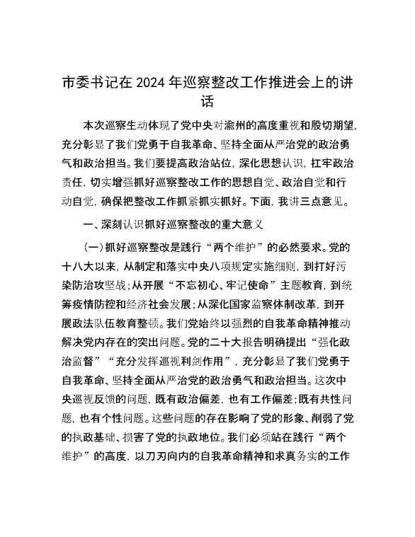 市委书记在2024年巡察整改工作推进会上的讲话 2024-10-25 Word模板 108 购买前,请一定要先点击这里看看,欢迎持续关注,精彩模板每天推送 预览结束,本文件为word文档,一共7页,共3196字,请购买后,下载后查看 购买前,请一定要先点击这里看看,欢迎持续关注,精彩模板每天推送 资源下载下载价格29 RMBVIP免费升级VIP点击检测网盘有效后购买有任何充值和下载问题请加微信:xuexixuexi66 0 演讲发言
