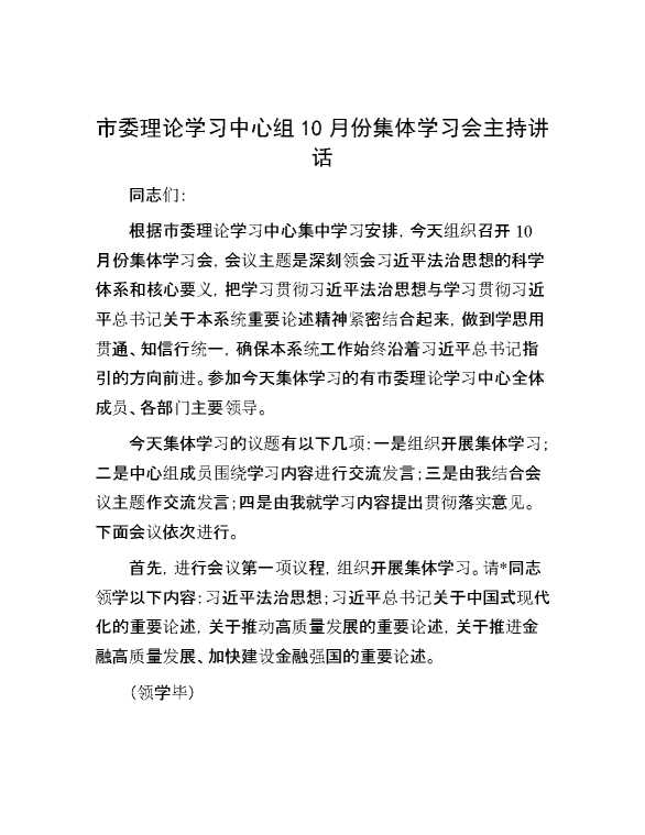 市委理论学习中心组10月份集体学习会主持讲话 2024-10-25 Word模板 106 购买前,请一定要先点击这里看看,欢迎持续关注,精彩模板每天推送 预览结束,本文件为word文档,一共11页,共5472字,请购买后,下载后查看 购买前,请一定要先点击这里看看,欢迎持续关注,精彩模板每天推送 资源下载下载价格29 RMBVIP免费升级VIP点击检测网盘有效后购买有任何充值和下载问题请加微信:xuexixuexi66 0 演讲发言