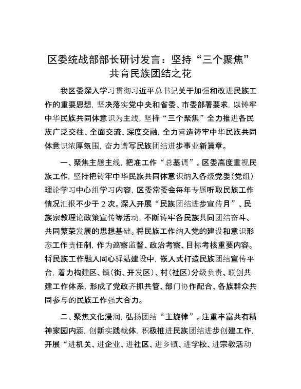 区委统战部部长研讨发言:坚持“三个聚焦”共育民族团结之花 2024-10-25 Word模板 141 购买前,请一定要先点击这里看看,欢迎持续关注,精彩模板每天推送 预览结束,本文件为word文档,一共3页,共1044字,请购买后,下载后查看 购买前,请一定要先点击这里看看,欢迎持续关注,精彩模板每天推送 资源下载下载价格29 RMBVIP免费升级VIP点击检测网盘有效后购买有任何充值和下载问题请加微信:xuexixuexi66 0 演讲发言