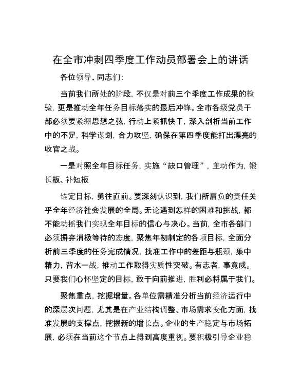 在全市冲刺四季度工作动员部署会上的讲话 2024-10-25 Word模板 103 购买前,请一定要先点击这里看看,欢迎持续关注,精彩模板每天推送 预览结束,本文件为word文档,一共5页,共1848字,请购买后,下载后查看 购买前,请一定要先点击这里看看,欢迎持续关注,精彩模板每天推送 资源下载下载价格29 RMBVIP免费升级VIP点击检测网盘有效后购买有任何充值和下载问题请加微信:xuexixuexi66 0 演讲发言