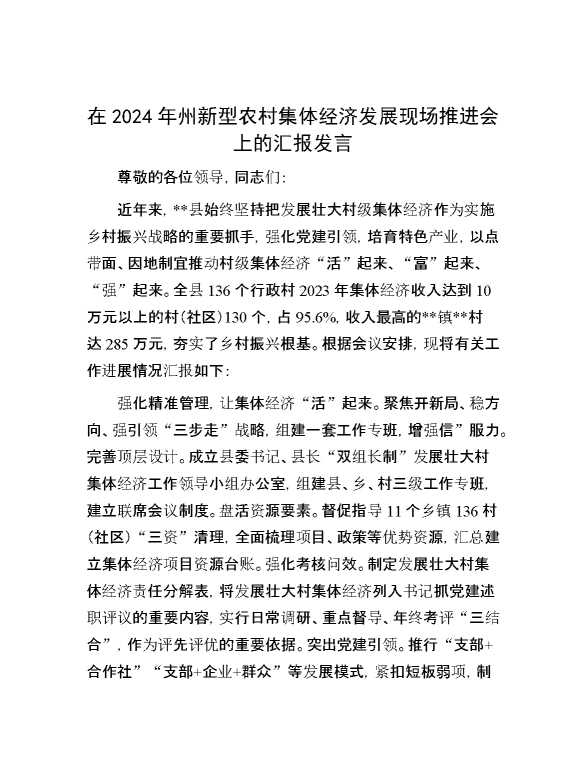 在2024年州新型农村集体经济发展现场推进会上的汇报发言 2024-10-25 Word模板 104 购买前,请一定要先点击这里看看,欢迎持续关注,精彩模板每天推送 预览结束,本文件为word文档,一共4页,共1472字,请购买后,下载后查看 购买前,请一定要先点击这里看看,欢迎持续关注,精彩模板每天推送 资源下载下载价格29 RMBVIP免费升级VIP点击检测网盘有效后购买有任何充值和下载问题请加微信:xuexixuexi66 0 演讲发言