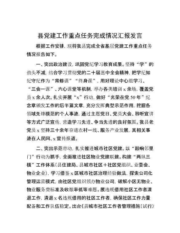 县党建工作重点任务完成情况汇报发言 2024-10-25 Word模板 167 购买前,请一定要先点击这里看看,欢迎持续关注,精彩模板每天推送 预览结束,本文件为word文档,一共3页,共1340字,请购买后,下载后查看 购买前,请一定要先点击这里看看,欢迎持续关注,精彩模板每天推送 资源下载下载价格29 RMBVIP免费升级VIP点击检测网盘有效后购买有任何充值和下载问题请加微信:xuexixuexi66 0 演讲发言