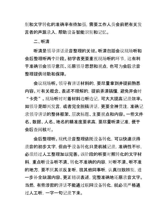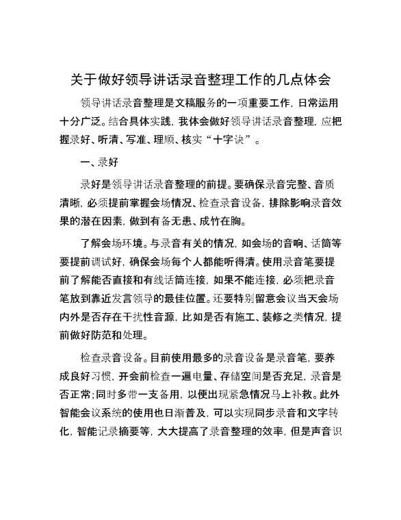 关于做好领导讲话录音整理工作的几点体会【45159】 2024-10-25 Word模板 106 购买前,请一定要先点击这里看看,欢迎持续关注,精彩模板每天推送 预览结束,本文件为word文档,一共5页,共2172字,请购买后,下载后查看 购买前,请一定要先点击这里看看,欢迎持续关注,精彩模板每天推送 资源下载下载价格29 RMBVIP免费升级VIP点击检测网盘有效后购买有任何充值和下载问题请加微信:xuexixuexi66 0 演讲发言