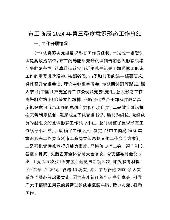 市工商局2024年第三季度意识形态工作总结 2024-10-28 Word模板 81 购买前,请一定要先点击这里看看,欢迎持续关注,精彩模板每天推送 预览结束,本文件为word文档,一共6页,共2755字,请购买后,下载后查看 购买前,请一定要先点击这里看看,欢迎持续关注,精彩模板每天推送 资源下载下载价格29 RMBVIP免费升级VIP点击检测网盘有效后购买有任何充值和下载问题请加微信:xuexixuexi66 0 总结汇报