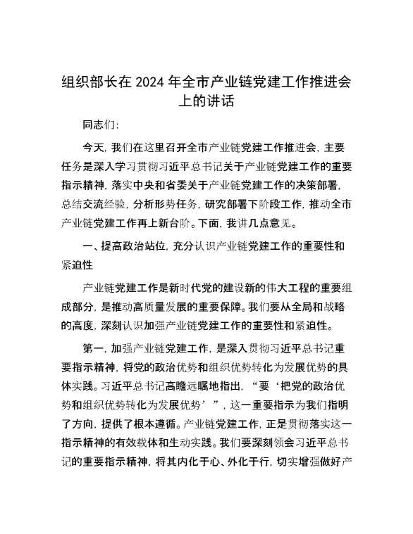 组织部长在2024年全市产业链党建工作推进会上的讲话 2024-10-30 Word模板 99 购买前,请一定要先点击这里看看,欢迎持续关注,精彩模板每天推送 预览结束,本文件为word文档,一共6页,共3010字,请购买后,下载后查看 购买前,请一定要先点击这里看看,欢迎持续关注,精彩模板每天推送 资源下载下载价格29 RMBVIP免费升级VIP点击检测网盘有效后购买有任何充值和下载问题请加微信:xuexixuexi66 0 演讲发言
