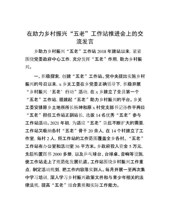 在助力乡村振兴“五老”工作站推进会上的交流发言 2024-10-30 Word模板 96 购买前,请一定要先点击这里看看,欢迎持续关注,精彩模板每天推送 预览结束,本文件为word文档,一共4页,共1569字,请购买后,下载后查看 购买前,请一定要先点击这里看看,欢迎持续关注,精彩模板每天推送 资源下载下载价格29 RMBVIP免费升级VIP点击检测网盘有效后购买有任何充值和下载问题请加微信:xuexixuexi66 0 演讲发言