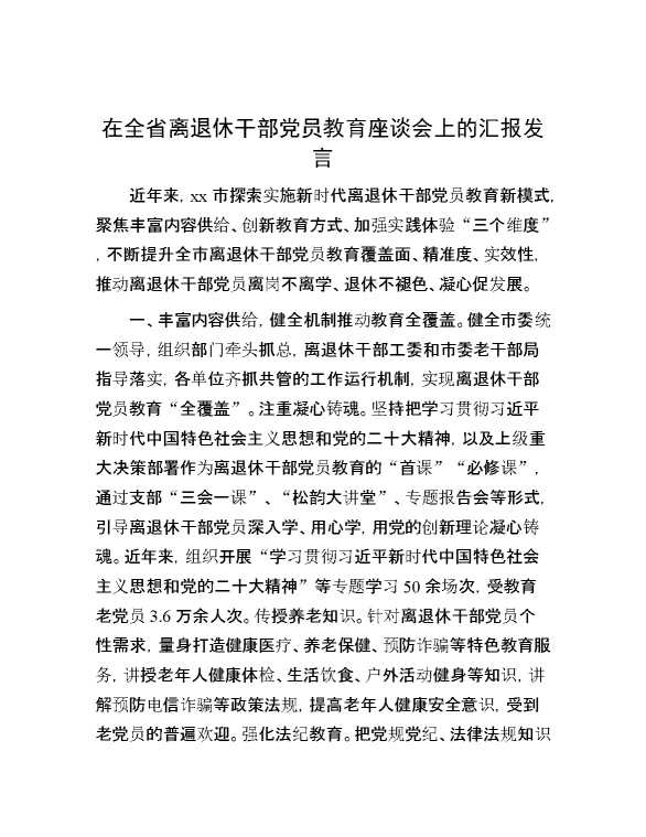 在全省离退休干部党员教育座谈会上的汇报发言 2024-10-30 Word模板 93 购买前,请一定要先点击这里看看,欢迎持续关注,精彩模板每天推送 预览结束,本文件为word文档,一共3页,共1362字,请购买后,下载后查看 购买前,请一定要先点击这里看看,欢迎持续关注,精彩模板每天推送 资源下载下载价格29 RMBVIP免费升级VIP点击检测网盘有效后购买有任何充值和下载问题请加微信:xuexixuexi66 0 演讲发言