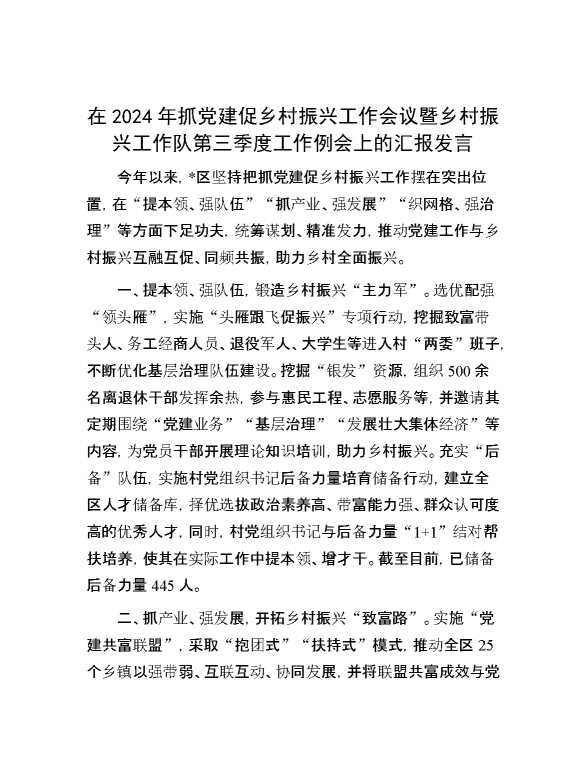 在2024年抓党建促乡村振兴工作会议暨乡村振兴工作队第三季度工作例会上的汇报发言 2024-10-30 Word模板 85 购买前,请一定要先点击这里看看,欢迎持续关注,精彩模板每天推送 预览结束,本文件为word文档,一共2页,共949字,请购买后,下载后查看 购买前,请一定要先点击这里看看,欢迎持续关注,精彩模板每天推送 资源下载下载价格29 RMBVIP免费升级VIP点击检测网盘有效后购买有任何充值和下载问题请加微信:xuexixuexi66 0 演讲发言