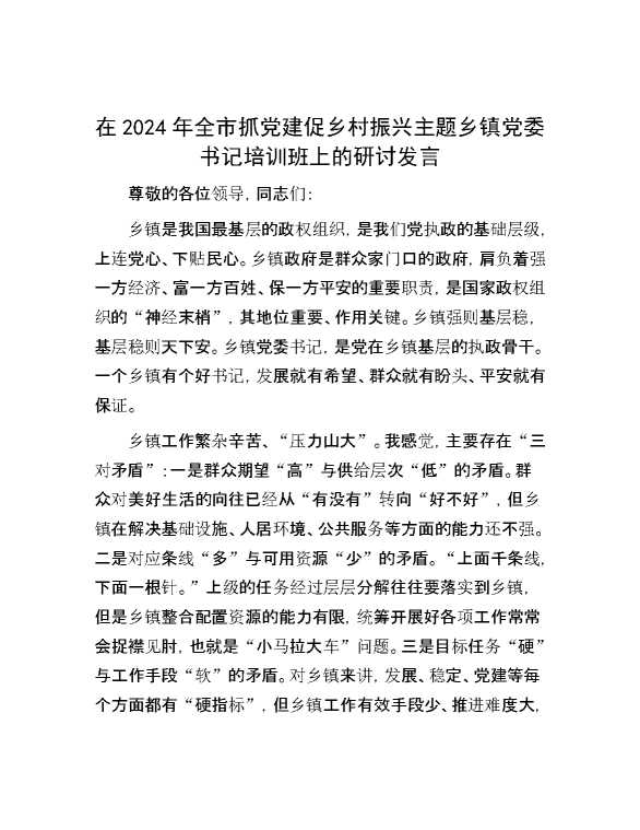 在2024年全市抓党建促乡村振兴主题乡镇党委书记培训班上的研讨发言 2024-10-30 Word模板 127 购买前,请一定要先点击这里看看,欢迎持续关注,精彩模板每天推送 预览结束,本文件为word文档,一共20页,共10253字,请购买后,下载后查看 购买前,请一定要先点击这里看看,欢迎持续关注,精彩模板每天推送 资源下载下载价格29 RMBVIP免费升级VIP点击检测网盘有效后购买有任何充值和下载问题请加微信:xuexixuexi66 0 演讲发言