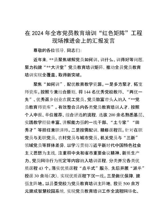 在2024年全市党员教育培训“红色矩阵”工程现场推进会上的汇报发言 2024-10-30 Word模板 92 购买前,请一定要先点击这里看看,欢迎持续关注,精彩模板每天推送 预览结束,本文件为word文档,一共4页,共1576字,请购买后,下载后查看 购买前,请一定要先点击这里看看,欢迎持续关注,精彩模板每天推送 资源下载下载价格29 RMBVIP免费升级VIP点击检测网盘有效后购买有任何充值和下载问题请加微信:xuexixuexi66 0 演讲发言
