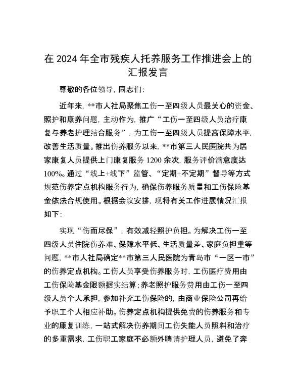 在2024年全市残疾人托养服务工作推进会上的汇报发言 2024-10-30 Word模板 83 购买前,请一定要先点击这里看看,欢迎持续关注,精彩模板每天推送 预览结束,本文件为word文档,一共3页,共1050字,请购买后,下载后查看 购买前,请一定要先点击这里看看,欢迎持续关注,精彩模板每天推送 资源下载下载价格29 RMBVIP免费升级VIP点击检测网盘有效后购买有任何充值和下载问题请加微信:xuexixuexi66 0 演讲发言