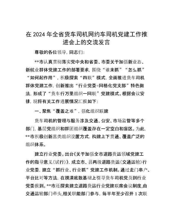 在2024年全省货车司机网约车司机党建工作推进会上的交流发言 2024-10-30 Word模板 87 购买前,请一定要先点击这里看看,欢迎持续关注,精彩模板每天推送 预览结束,本文件为word文档,一共6页,共2366字,请购买后,下载后查看 购买前,请一定要先点击这里看看,欢迎持续关注,精彩模板每天推送 资源下载下载价格29 RMBVIP免费升级VIP点击检测网盘有效后购买有任何充值和下载问题请加微信:xuexixuexi66 0 演讲发言