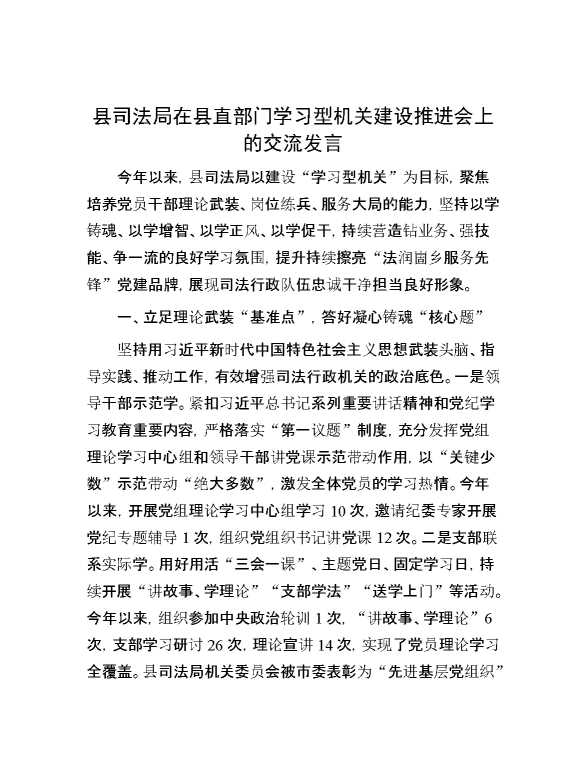 县司法局在县直部门学习型机关建设推进会上的交流发言 2024-10-30 Word模板 95 购买前,请一定要先点击这里看看,欢迎持续关注,精彩模板每天推送 预览结束,本文件为word文档,一共4页,共1754字,请购买后,下载后查看 购买前,请一定要先点击这里看看,欢迎持续关注,精彩模板每天推送 资源下载下载价格29 RMBVIP免费升级VIP点击检测网盘有效后购买有任何充值和下载问题请加微信:xuexixuexi66 0 演讲发言