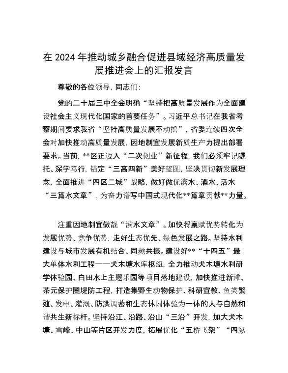 在2024年推动城乡融合促进县域经济高质量发展推进会上的汇报发言 2024-10-30 Word模板 100 购买前,请一定要先点击这里看看,欢迎持续关注,精彩模板每天推送 预览结束,本文件为word文档,一共4页,共1898字,请购买后,下载后查看 购买前,请一定要先点击这里看看,欢迎持续关注,精彩模板每天推送 资源下载下载价格29 RMBVIP免费升级VIP点击检测网盘有效后购买有任何充值和下载问题请加微信:xuexixuexi66 0 演讲发言